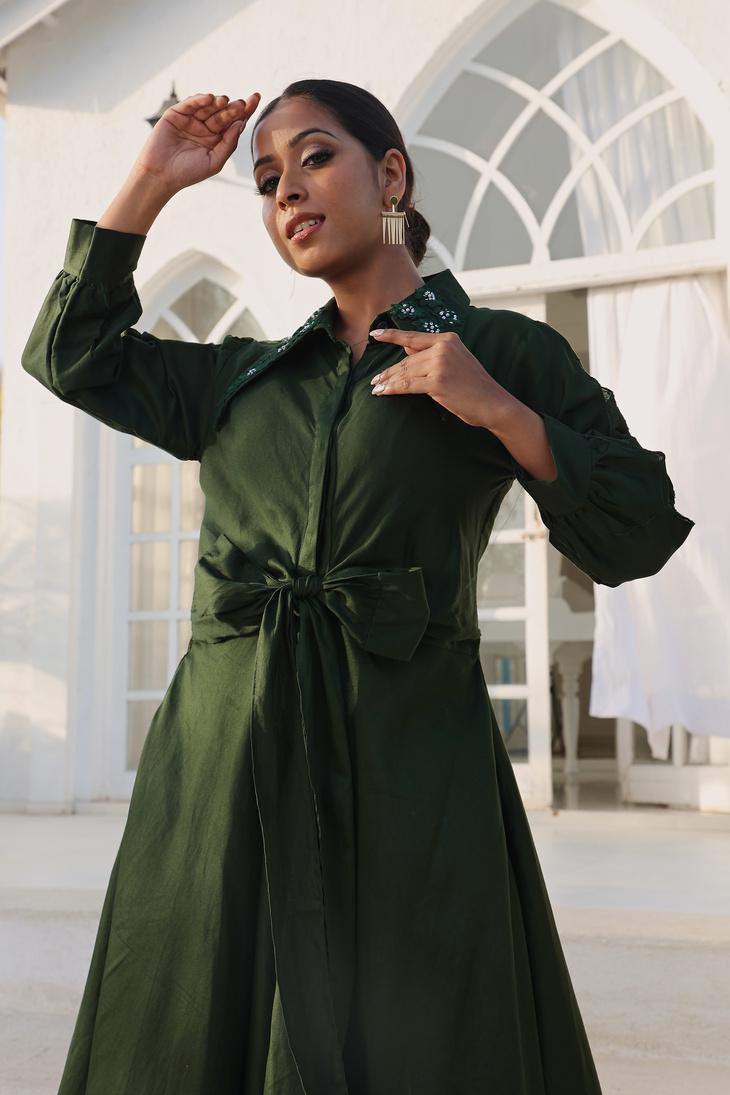 Bottle Green Collar Detailed Shirt Dress