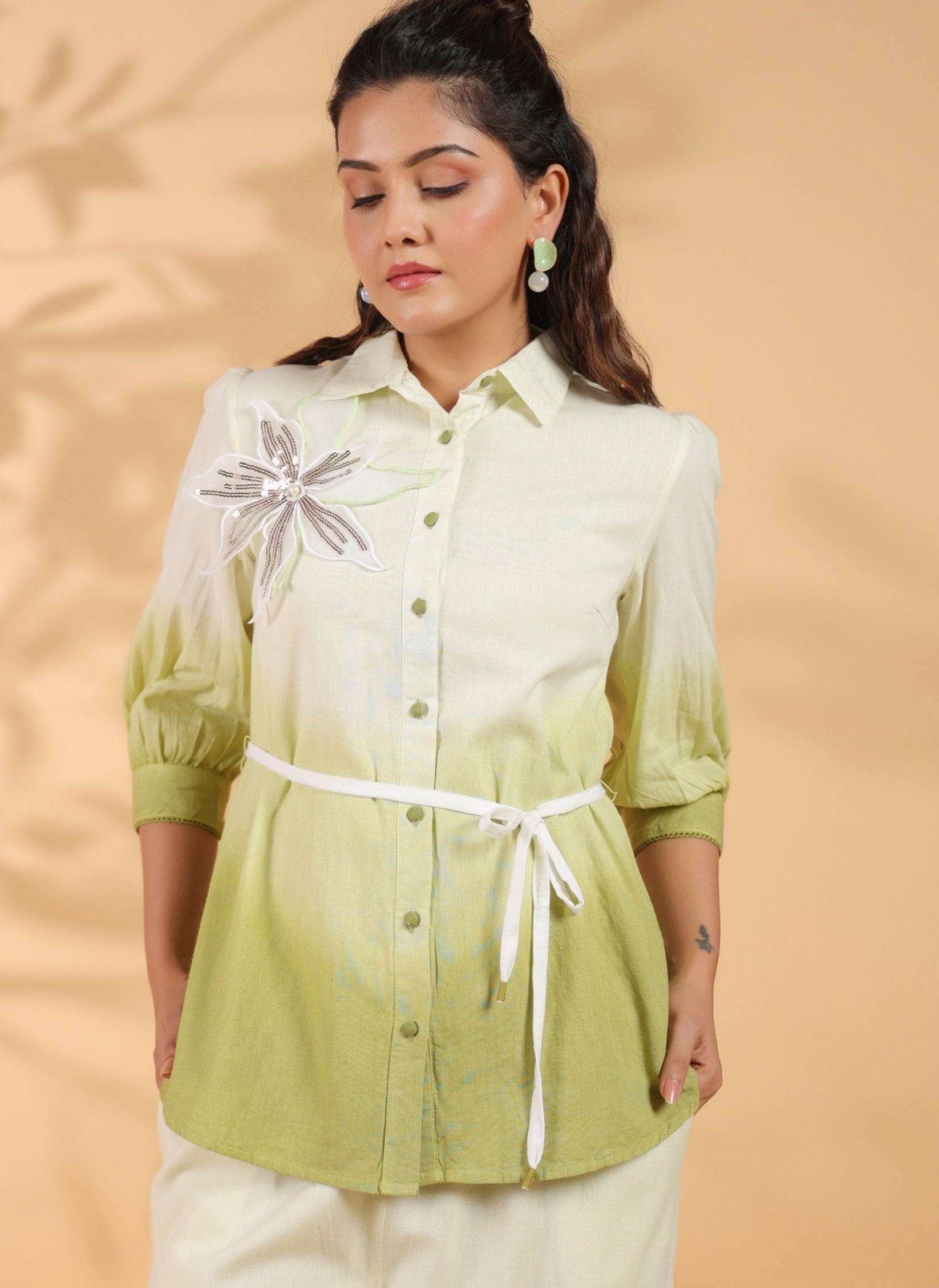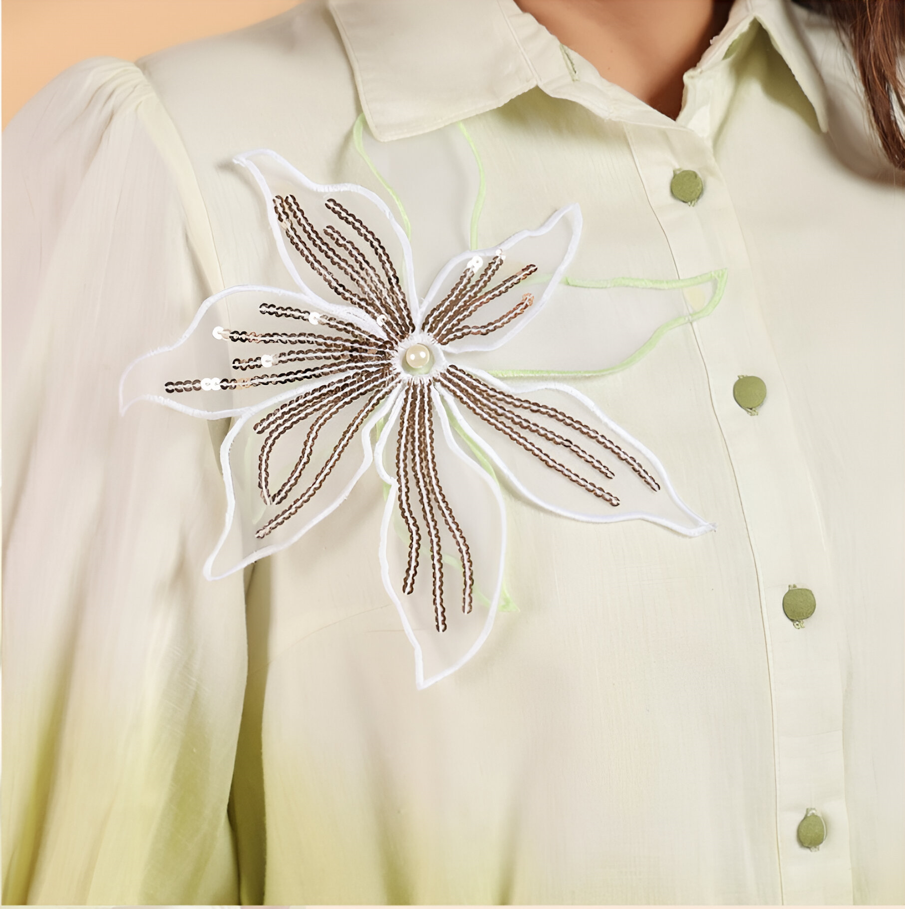 White and Sage Green Applique Flower Embroidered Cotton Flex Co-ord Set